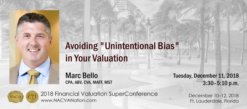 On Tuesday, December 11th, 2018, Business Valuation partner, Marc Bello, will present at NACVA’s Financial Valuation SuperConference. This conference highlights, business valuation, financial litigation, healthcare valuation, exit strategies, mergers and acquisitions, and transaction advisory services. Marc will present, Avoiding “Unintentional Bias” in Your Valuation. Attendees of this session will be able to: