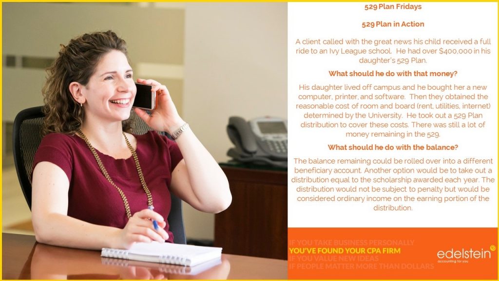 For individuals and families, our objective is to minimize your tax payments, preserve wealth and achieve your long-term goals. Please email us at info@edelsteincpa.com for more information on 529 Plans or any other assistance you may be seeking. To see all of our 529 Plan Friday posts, click here.