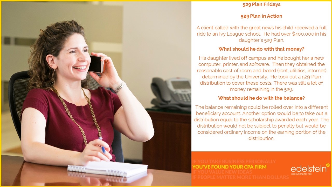 For individuals and families, our objective is to minimize your tax payments, preserve wealth and achieve your long-term goals. Please email us at info@edelsteincpa.com for more information on 529 Plans or any other assistance you may be seeking. To see all of our 529 Plan Friday posts, click here.