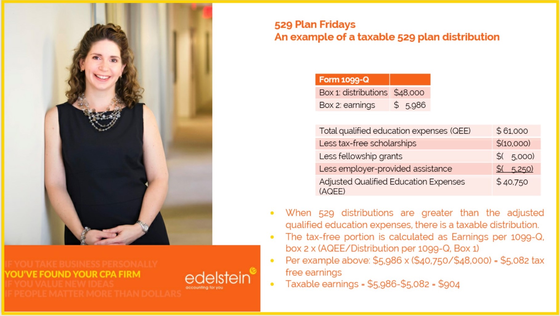 529 Plan Fridays https://www.edelsteincpa.com/529-plan-fridays-7/?utm_source=rss&utm_medium=rss&utm_campaign=529-plan-fridays-7 Thu, 06 Aug 2020 18:36:12 +0000 https://www.edelsteincpa.com/?p=5218 Last week, Tax Partner, Kate Rooney, answered “What are some cautionary flags to be aware of with 529 Plans?”. Today she’ll share an example of a taxable 529 Plan distribution.