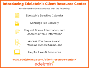 Resources – Edelstein & Company, LLP https://www.edelsteincpa.com Accounting for You Thu, 22 Dec 2022 17:36:35 +0000 en-US hourly 1 https://wordpress.org/?v=6.5.3 Introducing Edelstein’s Client Resource Center https://www.edelsteincpa.com/introducing-edelsteins-client-resource-center/?utm_source=rss&utm_medium=rss&utm_campaign=introducing-edelsteins-client-resource-center Thu, 22 Dec 2022 17:36:18 +0000 https://www.edelsteincpa.com/?p=7395 Edelstein is excited to have launched our Client Resource Center! Supporting your business needs and delivering exceptional client service is our goal. This page is meant to help you find answers to your questions quickly. The Client Resource Center includes links to popular pages, access to frequently requested forms, answers to frequently asked questions. and information on this page to save you time, answer your questions and provide the highest level of services. You can find this page here or by visiting the link at the top of each page on our website.
