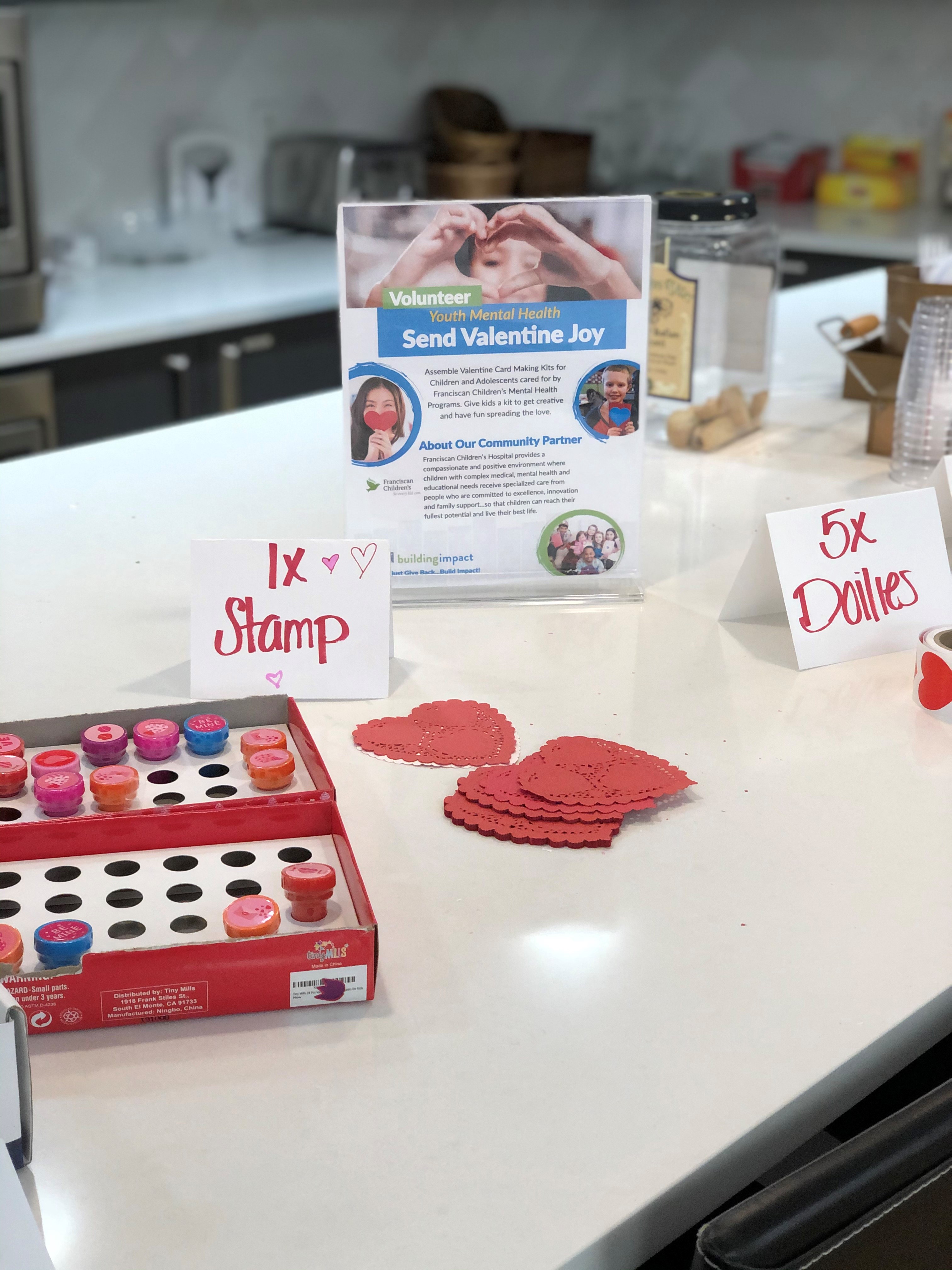 Last Friday, Building Impact came to Edelstein for an in office community service event. We volunteered our time to support youth mental health by assembling Valentine’s Day card making kits for children and adolescents cared for by Franciscan Children’s Mental Health Programs. We made cards and decorated bags filled with all the materials needed for them to create their own Valentine’s Day cards. We also had fun making Valentine Mad Libs!
