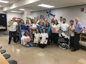 At the onset of 2018, we committed to taking part in five larger scale community service events to commemorate one per decade that we have been in business.  As we celebrated turning 50 this year, it was imperative to incorporate elements of giving back into our festivities.  Yesterday, we took part in our final 50th event.  We went to the Eliot Family Resource Center in Everett to wrap holiday gifts and to make no-sew fleece blankets.  We worked with the Massachusetts Society of Prevention of Cruelty to Children (MSPCC) to align a need in the community with our volunteered services.  The MSPCC is a nonprofit, ” dedicated to leadership in protecting and promoting the rights and well-being of children and families.”