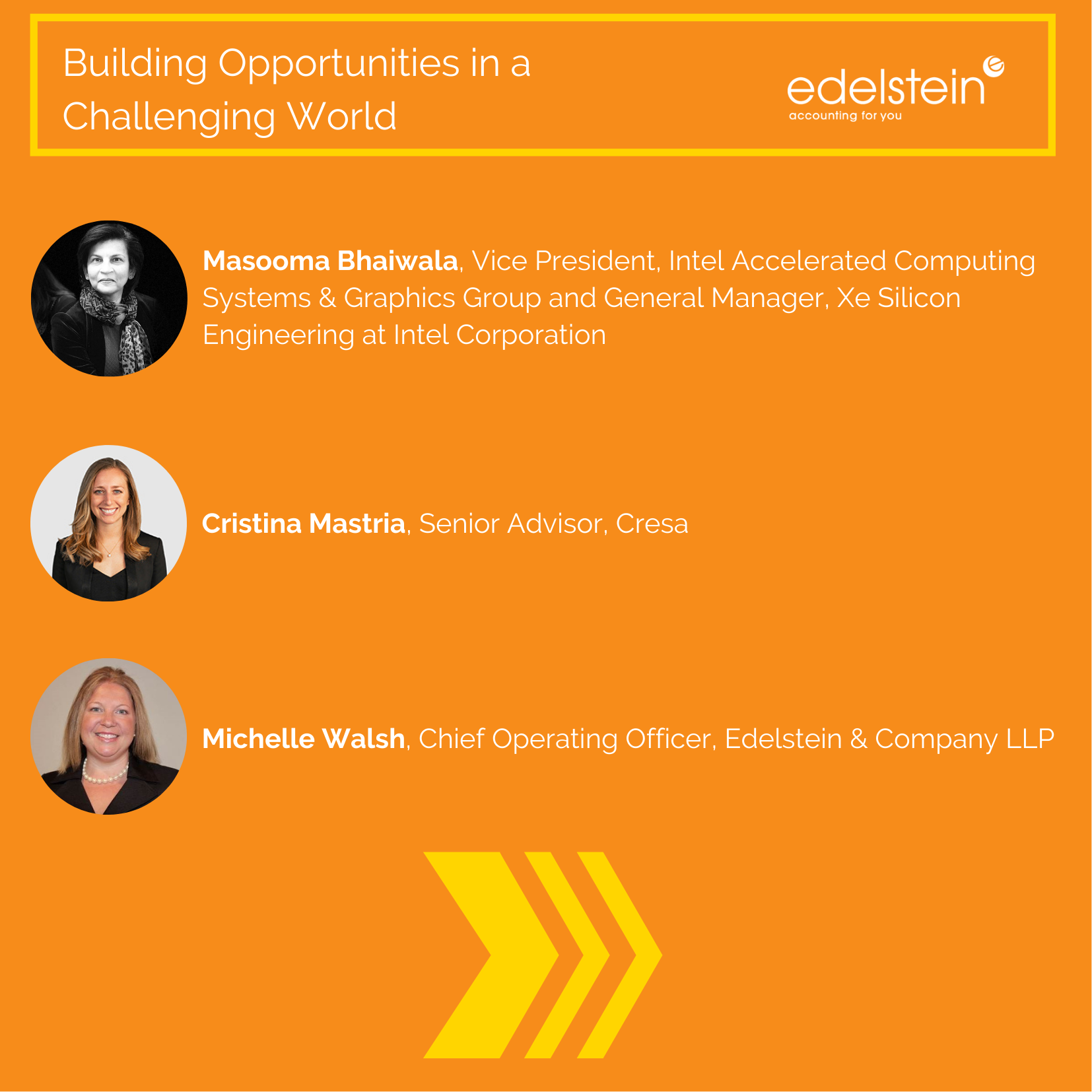 On November 4, 2021, Edelstein’s Women’s Initiative hosted the Building Opportunities in a Challenging World panel. All firm members were invited to attend to hear three speakers share how they have turned challenges into opportunities and the path it took to get them where they all are today. They discussed their opportunities, missed opportunities, and strategies to build opportunities for yourself. As the world is changing each day, we need to consistently find new ways to re-invent ourselves.
